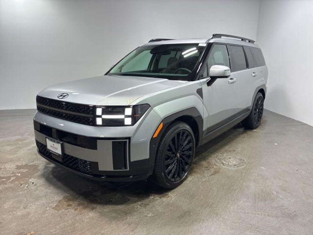 Option Group 01, Santa Fe Calligraphy, 4D Sport Utility, Shiftronic, AWD, Shimmering Silver Pearl, Gray Leather, 12 Speakers, 3rd row seats: bench, 4-Wheel Disc Brakes, ABS brakes, Air Conditioning, Alloy wheels, AM/FM radio: SiriusXM, Apple CarPlay & Android Auto, Auto High-beam Headlights, Auto-dimming Rear-View mirror, Automatic temperature control, Brake assist, Bumpers: body-color, Cargo Tray, Carpeted Floor Mats, Delay-off headlights, Driver door bin, Driver vanity mirror, Dual front impact airbags, Dual front side impact airbags, Electronic Stability Control, Emergency communication system, Exterior Parking Camera Rear, Four wheel independent suspension, Front anti-roll bar, Front Bucket Seats, Front Center Armrest, Front dual zone A/C, Front reading lights, Fully automatic headlights, Garage door transmitter: HomeLink, Heads-Up Display, Heated & Ventilated Front Bucket Seats, Heated door mirrors, Heated front seats, Heated rear seats, Heated steering wheel, Illuminated entry, Knee airbag, Leather steering wheel, Low tire pressure warning, Memory seat, Navigation System, Occupant sensing airbag, Outside temperature display, Overhead airbag, Overhead console, Panic alarm, Passenger door bin, Passenger vanity mirror, Power door mirrors, Power driver seat, Power Liftgate, Power moonroof, Power passenger seat, Power steering, Power windows, Premium Nappa Leather Seat Trim, Radio: AM/FM/HD Bose Premium Audio System, Rain sensing wipers, Rear anti-roll bar, Rear side impact airbag, Rear window defroster, Rear window wiper, Remote keyless entry, Security system, Speed control, Speed-sensing steering, Split folding rear seat, Spoiler, Steering wheel mounted audio controls, Tachometer, Telescoping steering wheel, Tilt steering wheel, Traction control, Trip computer, Turn signal indicator mirrors, Variably intermittent wipers, Ventilated front seats, Wheel Locks, and Wheels: 21" x 8.5J Unique Dark Finish Alloy.